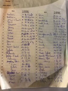 Tout le monde est concentré et impliqué, les relais s’enchaînent. L’équipe Endurance (Maryelle, Carine, Célia, Richard, Lotfi et Thomas) aligne les tours de façon régulière à raison de 5 tours toutes les heures environ. L’équipe découverte (Fiona, Alix, Marie-Laure, Sylvie, Muriel, Jenny, Louis, Luhan, Fred, David et Stéphane) est moins régulière, avec environ 4,25 tours à chaque heure qui passe. L’organisation de cette équipe est un peu plus complexe du fait des 3 jeunes que le règlement interdit de rouler la nuit et qui souhaitent donc enchaîner au maximum tant qu’ils le peuvent. On notera que les meilleurs chronos de l’équipe Découverte ont été réalisés par Louis, le grand espoir du club, qui du haut de ses 14 ans et un jour (concurrent le plus jeune des 24h qui a soufflés les bougies la veille au camping du circuit) a enrhumé tous les vieux plein d’expérience !