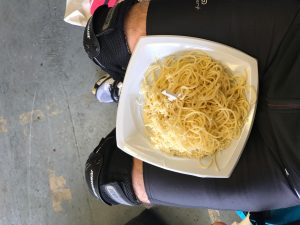 Un bon gros plat de pâtes est apporté directement au paddock et on organise les derniers relais.