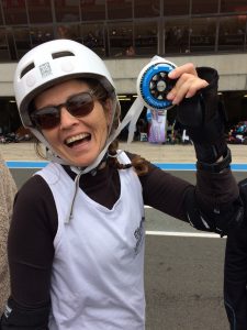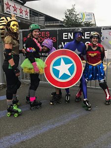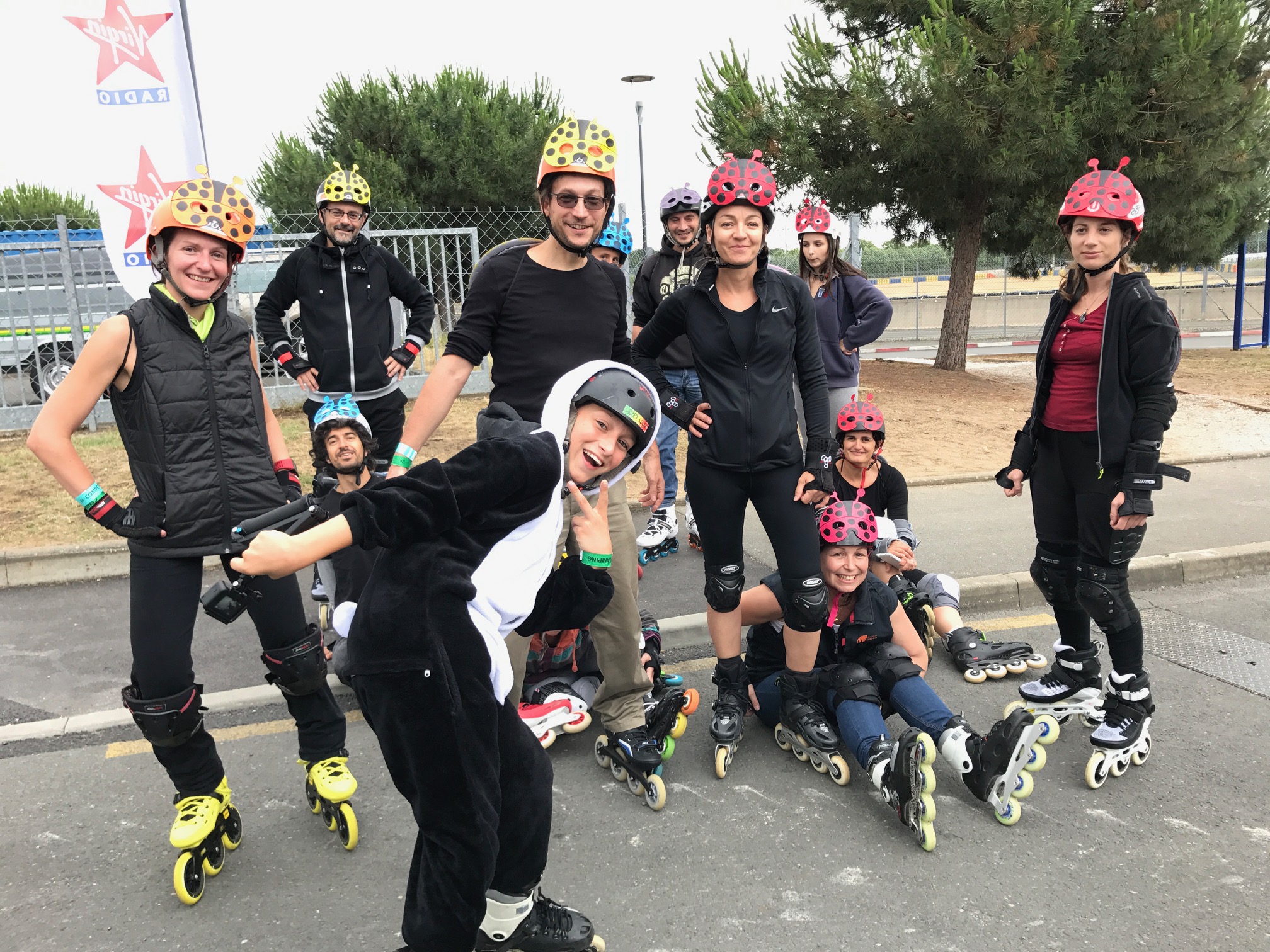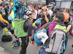 On y est : le grand jour est là et même si le temps est incertain, la motivation est quant à elle au beau fixe. Après un chaleureux petit déjeuner, Thomas s’active pour aller confirmer les engagements et chercher les dossards pendant que tout le monde se prépare pour la parade/reconnaissance du circuit. Ce sont 5000 patineurs (et skateurs) qui vont faire un ou deux tours du circuit à vitesse régulée par l’organisation afin d’effectuer une reconnaissance. Certains sont déguisés, d’autres pas, l’ambiance est bon enfant, tout le monde est joyeux et heureux de se retrouver à cette fête du roller.