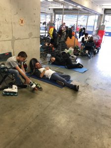 Tous s’enchaîne sans temps mort et nous voilà à 15h55 en train de suivre la procédure de départ type 24h du Mans Moto : chaque coureur partant pour son équipe est du côté paddock et va devoir courir pieds nus pour récupérer et chausser ses rollers situés de l’autre coté de la piste : heureusement il ne pleut pas sinon ça aurait été rigolo cette course en chaussettes dans les flaques 🙂