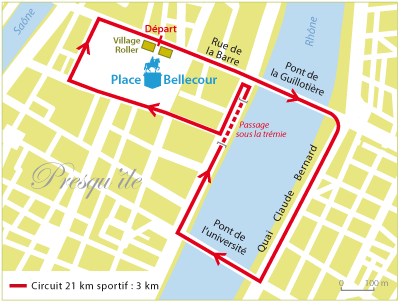 Le circuit proposé est une boucle de 3km, en plein centre ville, au départ de la Place Bellecour, plus grande place piétonne d’Europe, entre Saône et Rhône. Le semi-marathon (21km sportif) du dimanche était bien délicat à gérer, sous une pluie qui s’est invitée deux heures trop tôt. Avec de telles conditions, autant dire que le gratton du pont de la Guillotière était pénible, et que le virage du pont de l’université, l’épingle après la montée de la trémie, et même la ligne droite Place Bellecour, étaient bien trop glissants. Heureusement pas de chute à déplorer dans nos rangs.