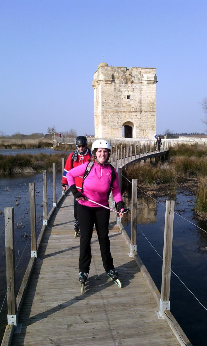 Rando roller en Camargue Gardoise, organisée par Avignon Roller Skating, entre le petit village de Gallician et la Tour Carbonnière (XIIIème) sur une voie roulante et réservée aux déplacements doux, le long du canal du Rhône à Sète. Merci à Serge pour la balade !